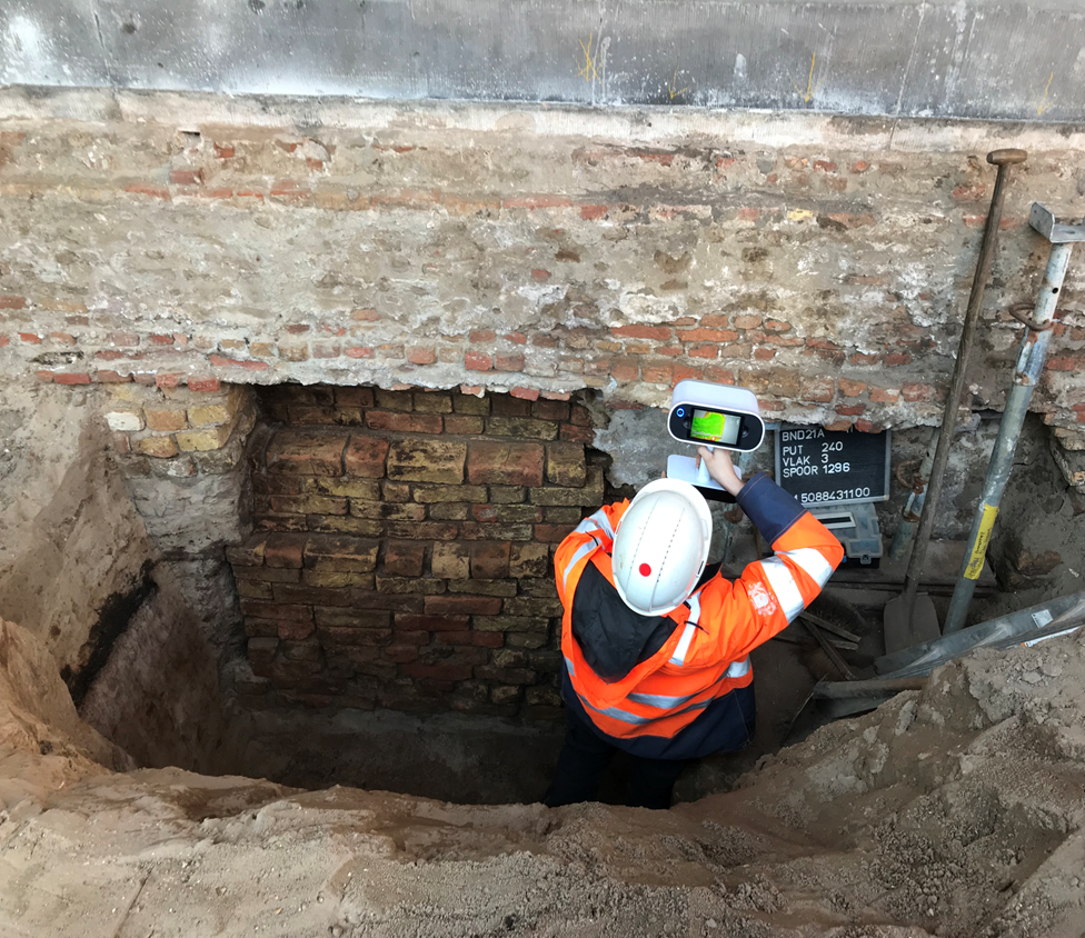 Bekijken onderzoeksdata tijdens onderzoek kasteel de Middelburg bij Alkmaar. (beeld: Nancy de Jong)