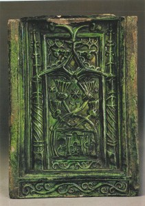 Rond 1500 werd de nistegel geleidelijk verdrongen door de reliëftegel, ook wel paneeltegel genoemd. Op dit soort tegels was het makkelijker om reliëfvormen en polychroom beschilderde decoraties aan te brengen. De tegel uit Huis ter Kleef is zo’n paneeltegel. Op de achterzijde zijn behalve roetsporen ook vaak nog de afdruk van een doek zichtbaar die men gebruikte om de tegel van de mal te scheiden. Dit is ook te zien op de Kleefse tegel. Gebruikte men in de 14de en 15de eeuw voornamelijk groen- en in mindere mate geelkleurig loodglazuur, aan het einde van de 15e eeuw lukte het de tegelbakkers ook witte, zwarte, blauwe, paarse, oranje en bruine kleuren te verkrijgen. Groenkleurig loodglazuur werd echter het meest toegepast.